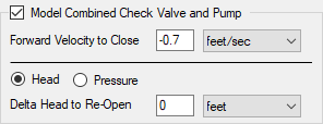 Delta Head/Pressure to Re-Open - The check valve can re-open during the simulation. In order to do so, it must have a corresponding pressure or head difference across it defined. A positive value here indicates that the upstream pressure must be higher than the downstream pressure.