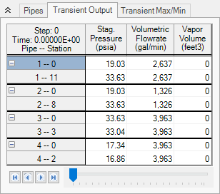 The Output window allows you to review both the steady-state and transient results. You can review the solutions for each time step (i.e., a time history) for which data was written to file. Also, a summary of the maximum and minimum transient results for each computing station is given on the Transient Max/Min tab in the pipe area. These two data sets are located on the Transient Output tab and Transient Max/Min tab in the pipe area of the Output window (see Figure 25 and Figure 26). Note that in order to display all pipe stations as shown in Figure 25, the model will need to be set to save data for all stations. By default, AFT Impulse will only save the inlet and outlet data points for each pipe. This can be changed on the Output Pipe Stations Panel in the Pipe Sectioning and Output Group in Analysis Setup.
