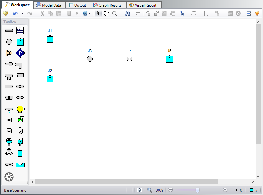 ØTo add a valve junction, click and drag a Valve junction from the Toolbox and place it on the Workspace as shown in Figure 8. The Valve will be assigned the default number J4. Add a third Reservoir junction, number J5, also shown in Figure 8.