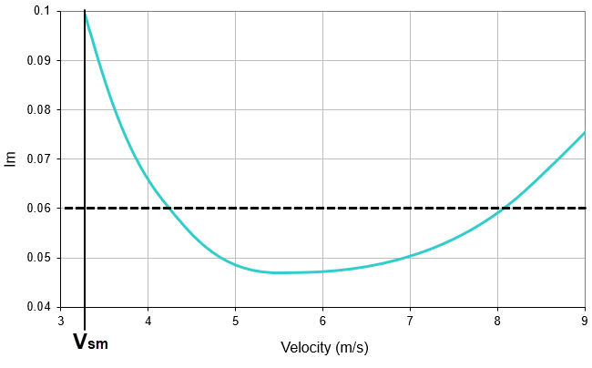 Often it is common practice to operate at or above the minimum im/jm point to achieve a desirable velocity ratio, and to avoid higher head losses that can occur to the left of the im/jm minimum. For example, in the below figure the minimum im occurs at about 5.25 m/s, so a mean velocity of 5.25 m/s or greater would be favorable. Model convergence may be difficult the closer the velocity ratio is to 1.0. Note that head loss curves like the one shown below will vary at different values of pipe diameter and solids concentration.