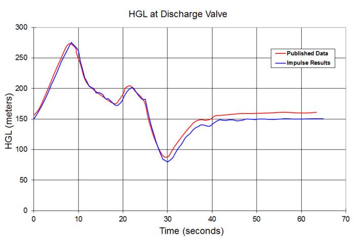 This model represents the solution for how a network responds to changes in a control valve. Differences between the published results and results from AFT Impulse may be attributed to the differences in how the relief valve is modeled in AFT Impulse, as is discussed in the assumptions above.