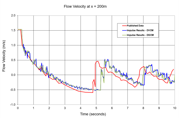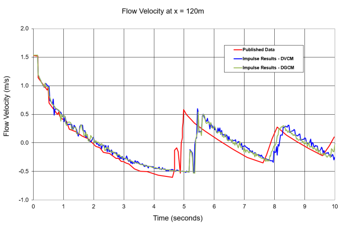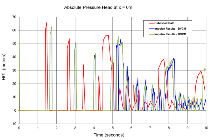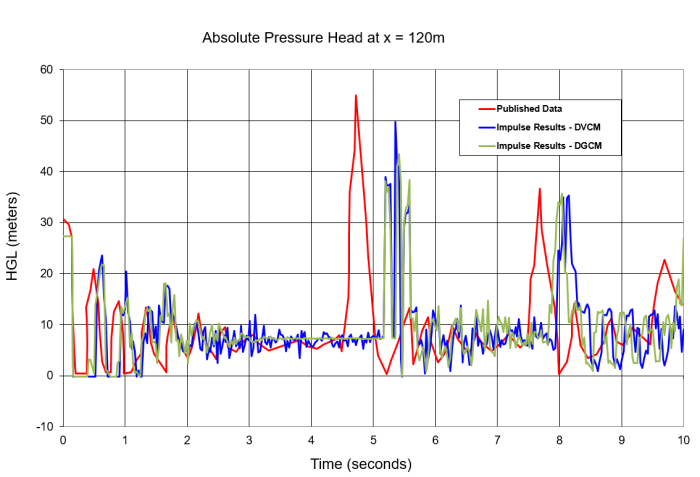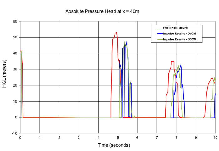 Figures 13-15 in the reference plot the results as Absolute Pressure Head, whereas Impulse plots pressure head as the Hydraulic Gradeline, which is a relative pressure. In the case of Figure 14, the results for Hydraulic Gradeline plotted from Impulse had to be adjusted by 4.56 m to match the absolute pressure head due to the change in pipe elevation at x = 40m.