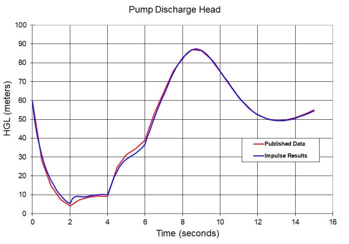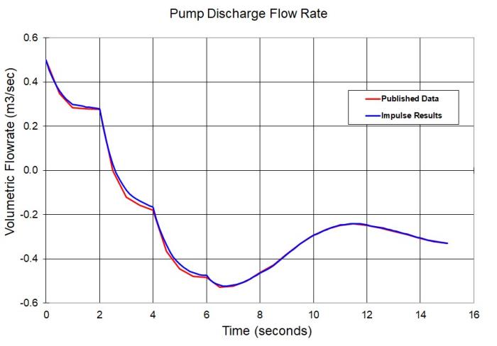 The results from AFT Impulse are compared to a simulation run by Chaudhry. Full details of the problem statement can be seen by clicking the link above. Close agreement can be observed in the results.
