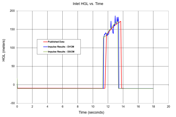 This example was designed to cause transient cavitation, and the flow does cavitate. As is common with cavitation modeling the timing of pressure spikes is marginal, but the major features and magnitude of prominent spikes is represented.