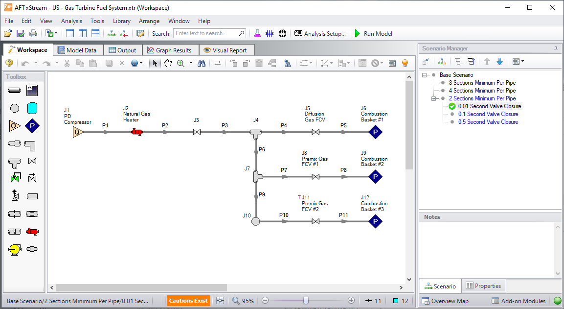 For this example, the US - Gas Turbine Fuel System model file was used. A copy of the completed model can be downloaded from the Gas Turbine Fuel System example, or can be found in the AFT xStream installation folder.
