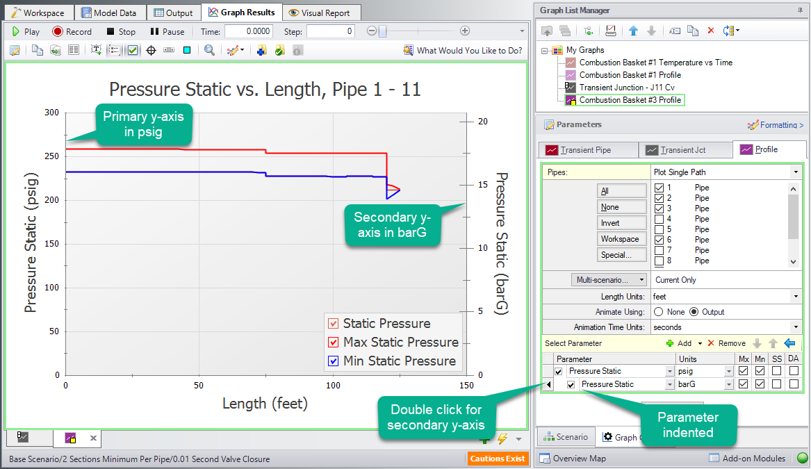 We now have the same plot twice, which is not the most efficient way to view this data. A better way would be to have the secondary parameter (which could be any of the available options for a profile plot) on a secondary y-axis. This can be done by double clicking on the arrow to the left of “Pressure Static: barG” or by selecting the blue right arrow on the “Select Parameter Row”. This will visibly indent the secondary parameter. When the Graph is regenerated it will now only be one plot of Pressure Static vs. Length, but it will have units displayed in psig on the primary y-axis and units of barG on the secondary y-axis.