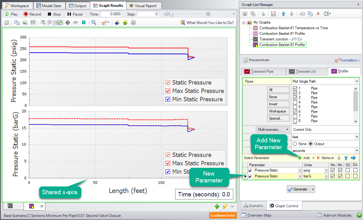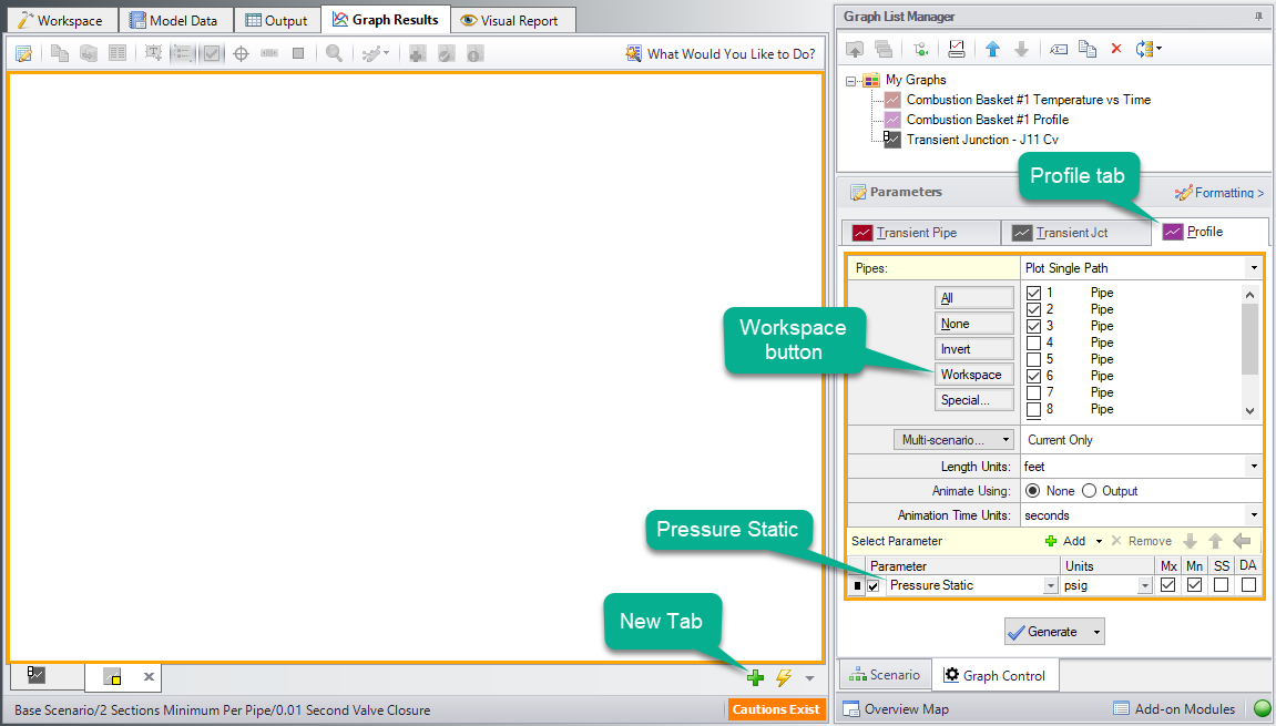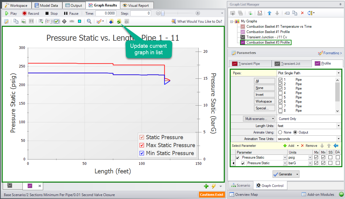The next step in the example is to make a new Graph in a separate tab. This is done by selecting the “New Tab” icon in the lower right. This Graph will be a “Profile” Graph that displays Static Pressure along the length of the flow path from the compressor through J11 and to Combustion Basket #3. Select pipes 1, 2, 3, 6, 9, 10, and 11 in the system and change the parameter to “Pressure Static” with units of length in feet and units of pressure in psig. Make sure that the Mx and Mn boxes are checked to display the maximum and minimum static pressures. Make sure "Animate Using" is set to none.