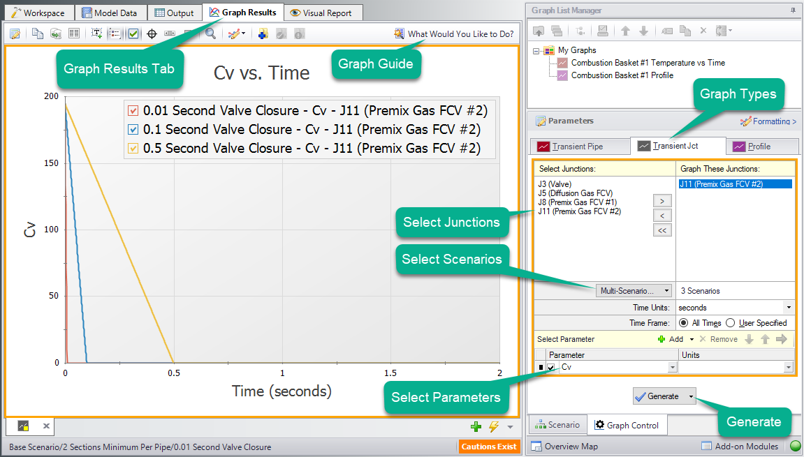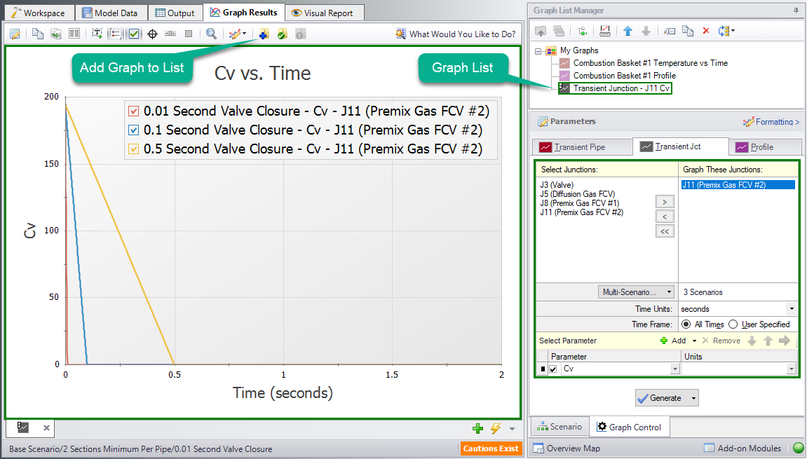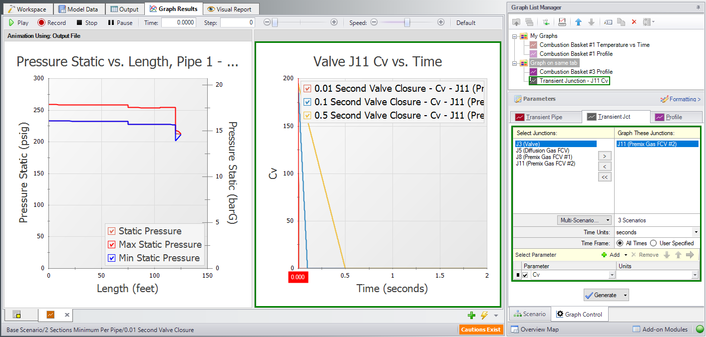 Go to the Graph Results Primary Window and determine what type of graph you want to generate. The first graph created in this example will be a Transient Junction Graph. The Transient Junction is one of several different types of Graphs that can be made. This graph is created by first selecting the Transient Jct tab and selecting the desired parameters. The only junction with saved transient data will be the valve J11. Add this junction to the “Graph These Junctions:” column by double-clicking the junction ID number, or selecting the “>” symbol. Select “Cv” as the parameter. Select all three valve opening children scenarios using the Multi-scenario... button, and then select “Generate”. This creates a plot of “Cv vs. Time” for all three scenarios on the left.