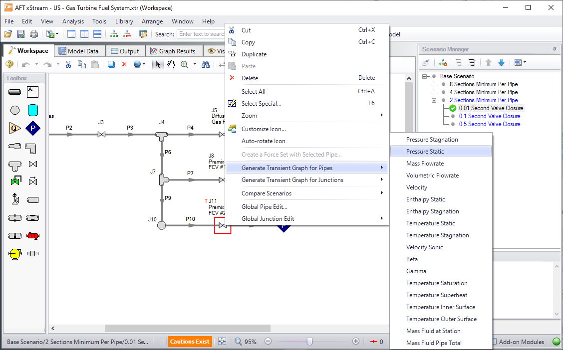 Some graphs can also be generated directly from the Workspace after running the model. To create a graph for the valve inlet and outlet static pressures from the Workspace right click on the valve J11, choose “Create Transient Graph for Pipes”, and select “Pressure Static”.