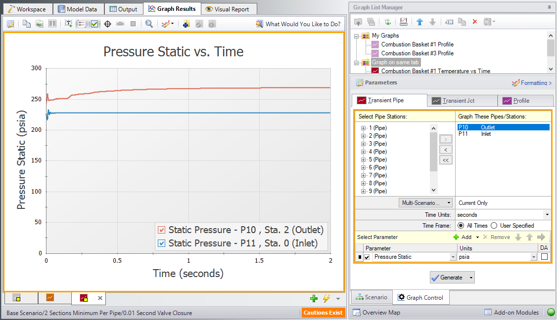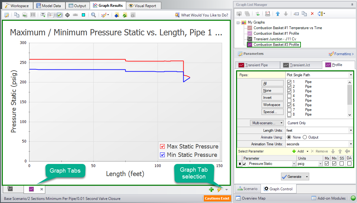The graph shows the minimum and maximum static pressures during the transient simulation for each pipe station along the flowpath. Save this new graph as a new Graph List item. The two graphs we have made can be switched quickly between by either selecting the graph from the list, by clicking on the corresponding tab, or using Graph Tab Selection.