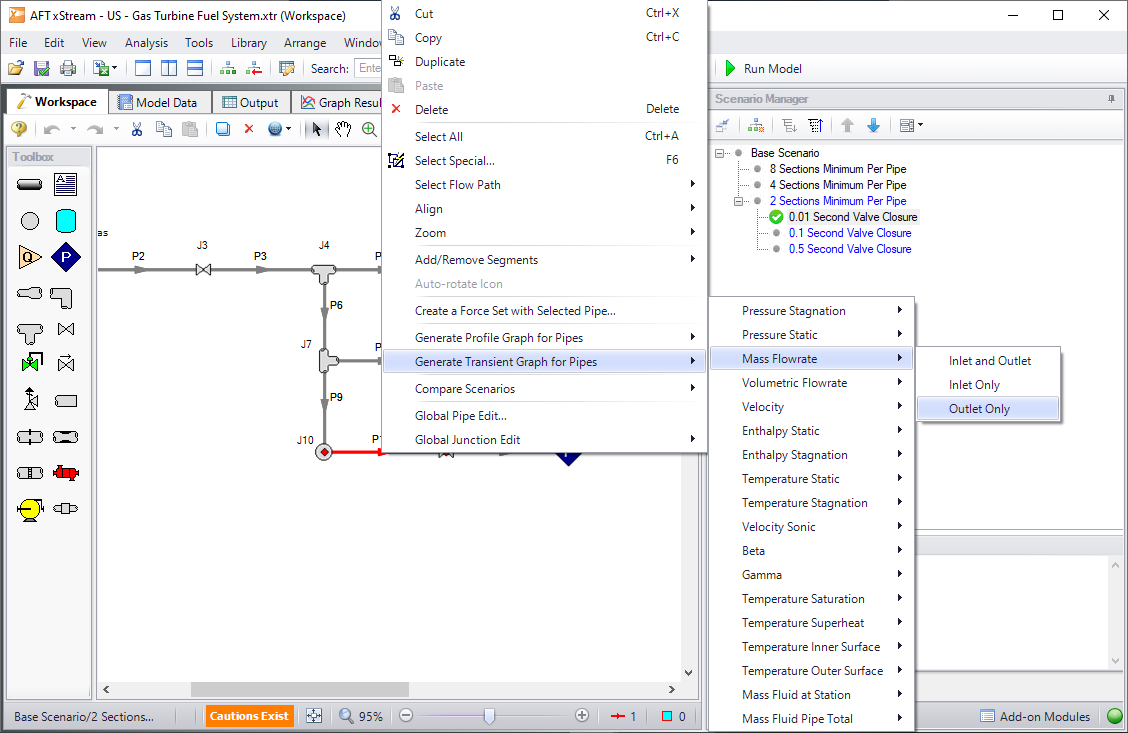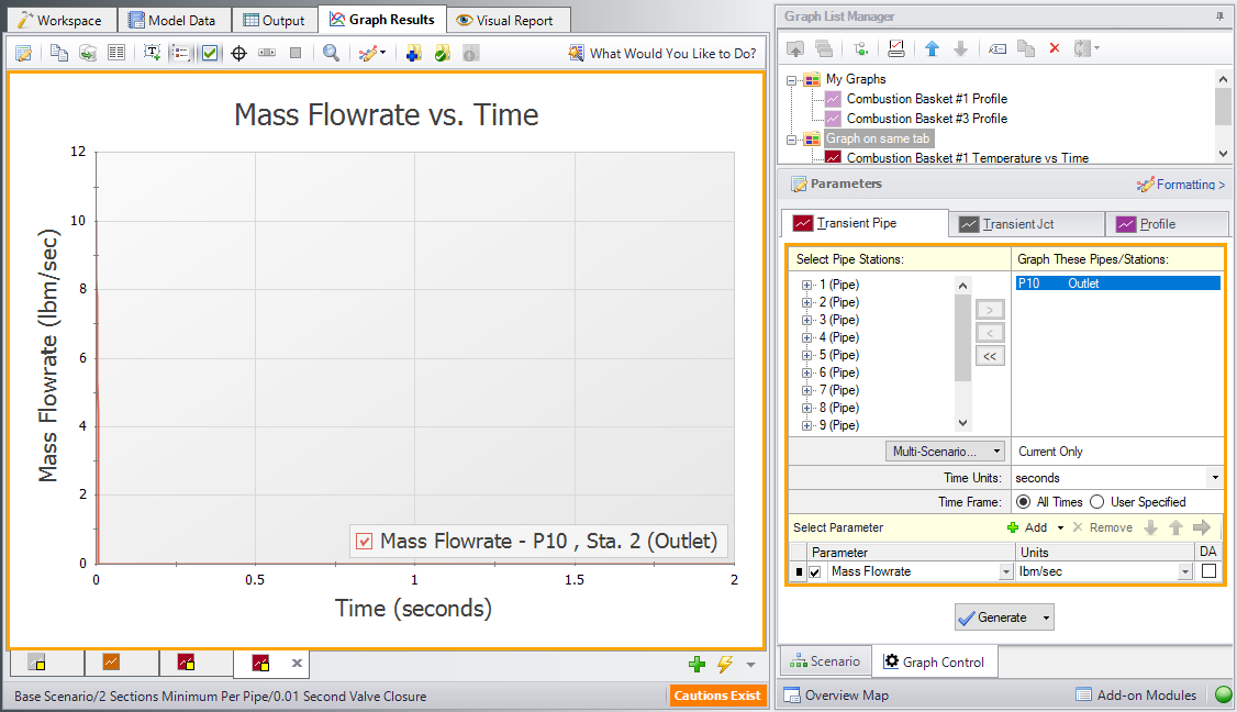 Make one more Graph from the Workspace by right-clicking pipe 10, selecting “Create Transient Graph for Pipes”, “Mass Flowrate”, and then “Outlet Only”.
