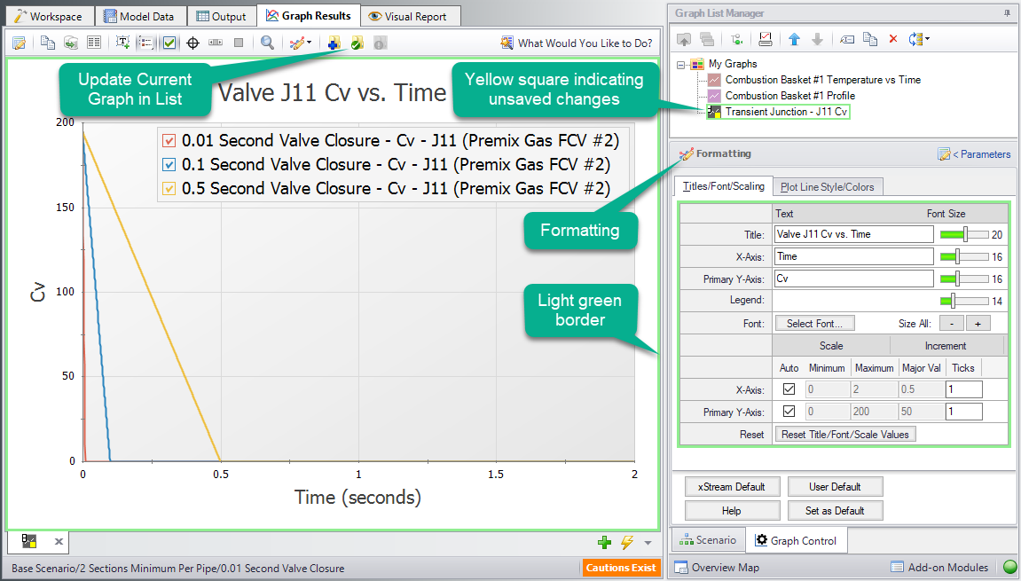 Formatting options are available by selecting “Formatting” above the different graph types. When formatting changes occur the border of a Graph will change from dark green to light green, indicating a change has been made to a graph in the Graph List. Another indicator that the Graph is not saved is the small yellow square over the icon on the tab. Here, the title has been changed from “Cv vs. Time” to “Valve J11 Cv vs. Time”. Once the formatting settings have been changed, this change and other formatting changes are not retained to the Graph unless “Update Current Graph in List” is selected.
