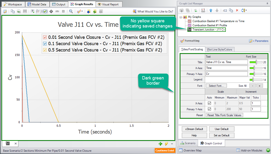 The Graph has been created, but has not yet been added to the list under "My Graphs". To add this Graph to the list, first select the “Add Graph to List” icon on the Graph Results toolbar (this option and many others can be accessed by right-clicking on the Graph at any time). Name the Graph “Transient Junction - J11 Cv”. The Graph has now been saved and will be easily regenerated with the same format if the output changes. The name of the saved Graph can be seen in the Graph List Manager, with two small squares in the icon associated with it indicating it is a multi-scenario graph. The border of the Graph has also changed to dark green along with borders of the parameters and the name of the Graph in the Graph List Manager, indicating that the Graph is current, saved, and that the displayed parameters are the ones used to generate the Graph.