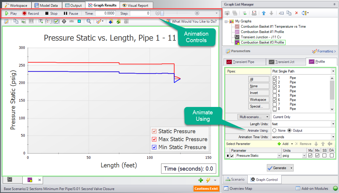 This is a useful graph, but animating the pressure profile over time can provide even more information. Animating from the Output file requires that all data for the pipe stations being animated to be saved to the Transient Output File in the Pipe Sectioning and Output panel, which is done by default.